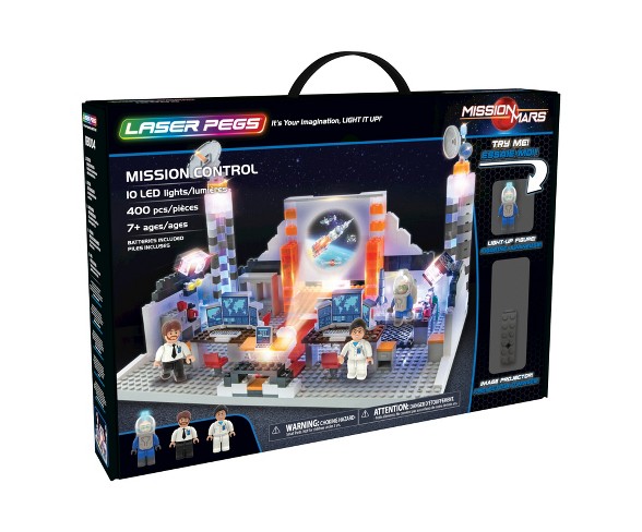 Description The adventure to Mars starts here with the Mission Control center. Prepare your astronauts for space in the training and research labs- then command the action while watching the amazing film projector bring it all to life on the giant display screen! With three interchangeable slides you can project an image on any flat surface. Laser Pegs are a classic building toy allowing kids to construct helicopters, robots, monster trucks, animals, dinosaurs, spaceships, rockets & more! Educational, sensory, and driven by a child's own creativity. Unlimited building possibilities. 100% compatible with Legos and other building brick sets. Number of Pieces: 400Dimensions (Overall): 12.5 inches (H) x 2.5 inches (W) x 18 inches (D)Suggested Age: 7 Years and UpWeight: 3.12 poundsMaterial: ABS (acrylonitrile butadiene styrene)Includes: Figures, batteries, light, LEGO compatible blocksScale: Not to ScaleCPSC Choking Hazard Warnings: Choking_hazard_small_partsPower Source: BatteryBattery: 23 LR41 Alkaline, Required, includedWarranty: 90 day limited warranty. To obtain a copy of the manufacturer's or supplier's warranty for this item prior to purchasing the item, please call Target Guest Services at 1-800-591-3869400pc, 10 LED Lights, 1 Light-Up Astronaut Suit, and 3 Astronaut Mini-FiguresLight-Up Film Projector with 3 Interchangeable Slides, Rotating Communication Satellites, and Coffee Station (for those all-nighters!)Decal Stickers, instruction Manual, and Batteries Included1 of 11 Mission Mars Series Sets! Estimated shipping dimensions: 12.5INCH X 18.0INCH X 2.5INCH DPCI : 204-07-2345 UPC : 810690028044 TCIN : 53982508 Estimated shippimg weight: 1.5POUND