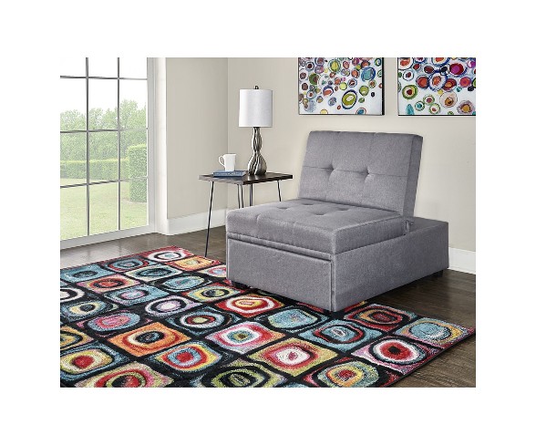 Description Perform magic with the Wales Convertible Sofa Bed from Powell Company. Hidden inside this simple, cushy chair is a reclining seat, an ottoman and a single bed! The back reclines into three different positions, and the bottom panel pulls out and pops up for an even surface that's great for additional seating or accommodating impromptu overnight guests. Pair up for conversational seating, then expand and slide together to create a double bed. If you're short on space but long on friends, this versatile option will help you make room for them all — and it tucks away neatly when the party's over.Number of Pieces: 1Seats up to: 1Dimensions (Overall): 17.88 inches (H) x 43.75 inches (W) x 31.12 inches (D)Care & Cleaning: Spot or wipe cleanHolds up to: 275 poundsMaterial: Pine, Metal (Frame)Weight: 81.59 poundsUpholstery: UpholsteredSeat Back Dimensions: 18.5 inches (H) x 31 inches (W)Assembly Details: No assembly requiredMaterial: Textile 1: PolyesterMaterial: Fill 1: Polyurethane FoamMaterial: Fill 2: Polyester FiberSeat Dimensions: 31 inches [W], 23.2 inches [D], & 17.88 inches [floor to seat top]Warranty: 6 month limited warranty. To obtain a copy of the manufacturer's or supplier's warranty for this item prior to purchasing the item, please call Target Guest Services at 1-800-591-3869Transitional convertible chair brings easy style to your decorWood and metal frame for a reliable buildVersatile construction is great when you're short on space Estimated shipping dimensions: 32.88INCH X 16.88INCH X 44.88INCH DPCI : 249-22-0082 UPC : 081438491318 TCIN : 53664312 Estimated shippimg weight: 179.0POUND