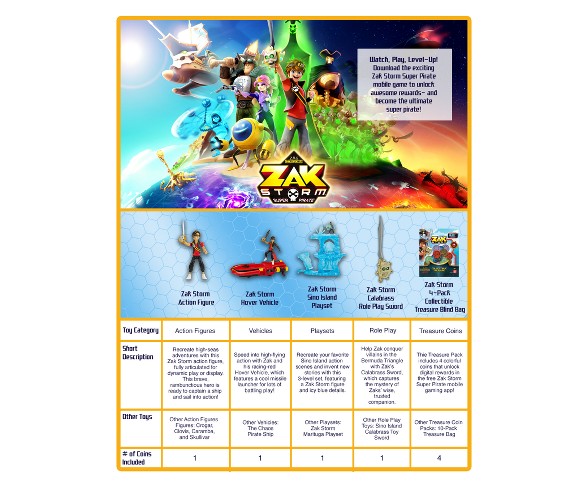 Description Set your compass to Sino Island, a mysterious frozen oasis in the Bermuda Triangle! With this action-packed set, Zak Storm fans can reenact favorite Sino scenes and invent new swashbuckling stories. The three-level set features multiple play areas and icy blue details — and comes with a Sino Zak action figure for epic adventures right out of the box! It also includes a collectible treasure coin. Zak Storm is a connected play experience, where kids WATCH, PLAY, and LEVEL-UP — to enjoy a mobile gaming experience like never before!Dimensions (Overall): 8 inches (H) x 6 inches (W) x 1.5 inches (D)Suggested Age: 4 Years and UpWeight: .22 poundsMaterial: ABS (acrylonitrile butadiene styrene), PVC (polyvinyl chloride)Number of Figures: 1CPSC Choking Hazard Warnings: Choking_hazard_small_partsNumber of accessories: 2Care & Cleaning: Spot or wipe clean3-level playset featuring multiple play areas and icy blue detailsIncludes Sino Zak action figureFeatures Sino Island collectible treasure coin. Estimated shipping dimensions: 11.375INCH X 9.625INCH X 11.75INCH DPCI : 087-06-7239 UPC : 045557415716 TCIN : 52789315 Estimated shippimg weight: 3.4POUND