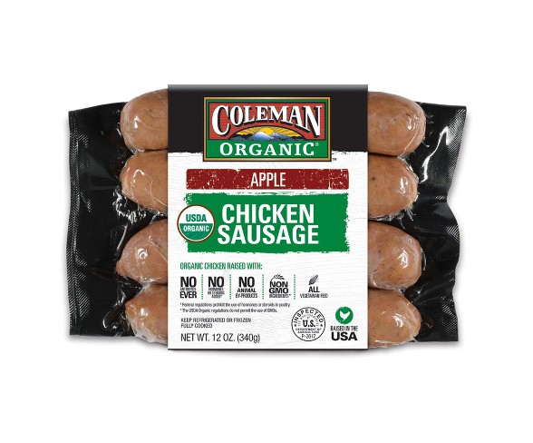 Description Tart apples are added to our ground organic boneless chicken for a sweet-and-savory fully cooked addition to just about any dish! Four (4) links approximately 3oz. each are included in the package.Contains: Does not contain any of the 8 major allergensCountry of Origin: United StatesCut of Meat: ThighStore: In a Refrigerated location at RefrigeratedType of Meat: ChickenFeatures: Free rangeDietary Needs: Certified Gluten Free, Organic certifiedState of Readiness: Prepared, heat and servePackage type: Individual item multi-servingExterior container material: PlasticSeasoning or marinade: Seasoning blendBone cut type: BonelessNet weight: 12 ouncesPackage Quantity: 1OrganicFree Range.Non GMO Project Verified.No Antibiotics Ever.All Vegetarian Diet. No Animal By-Products.Chicken Hatched, Raised, Harvested in USA. Estimated shipping dimensions: 3.5INCH X 2.0INCH X 13.0INCH DPCI : 210-12-0145 UPC : 072745634024 TCIN : 53361053 Estimated shippimg weight: 0.75POUND