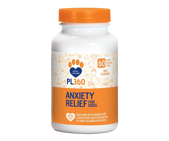 Description No one wants to see their pet stressed, so the PL360 Anxiety Relief Beef Flavored Dog Supplement helps take the edge off. Using all-natural, active ingredients like chamomile and tryptophan, it offers relief in situations that make your pet upset. Whether it's a trip to the vet or loud fireworks, these stressful events can make your pooch agitated and hyperactive, and this supplement works to ease their mind. They come in a chewable tablet form with a tasty beef flavor, so your dog will just think it's a treat. Made in the USAApplication Type: IngestibleCapacity (Volume): 4 cubic-inPet Caution Statement: Supervise pet while eatingIntended Pet Type: DogUsed For: AnxietyDuration: 24 hoursProduct Form: ChewablePet Lifestage: All AgesAnxiety relief for dogs that is specially formulated with chamomile and tryptophanGreat for stress-inducing situations like traveling, grooming, fireworks and trips to the vet.Scored, chewable tablets ensure easy and accurate dosage.Tasty beef flavor makes it easy to administer. Can also be crumbled into food.Contains natural active ingredients to promote health and wellness.Made in the USA and recommended by veterinarians. Never tested on animals Estimated shipping dimensions: 2.2INCH X 4.2INCH X 2.3INCH DPCI : 083-18-0086 UPC : 855527008028 TCIN : 53735195 Estimated shippimg weight: 0.25POUND
