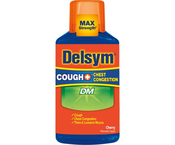 Description Get the mucus relief that you need when you have Adult Cherry Liquid Cough Plus Chest Congestion DM from Delsym. This unique formula gives you the power of a cough suppressant while working to thin out and loosen any of the mucus that you have built up in your chest. The great cherry flavor makes this adult cough suppressant easy to take for great results.Suggested Age: 12 Years and UpHealth Facts: Contains dextromethorphan HBrActive Ingredient Strength Value: 20 milligramsDuration: 4 hoursProduct Form: LiquidPrimary Active Ingredient: DextromethorphanPackage Quantity: 1Works as a powerful cough suppressant for long-lasting reliefHelps to loosen the mucus in the chest area to lower congestionGreat cherry flavor Estimated shipping dimensions: 2.5INCH X 0.6INCH X 5.7INCH DPCI : 094-14-0086 UPC : 363824213668 TCIN : 14771456 Estimated shippimg weight: 0.55POUND
