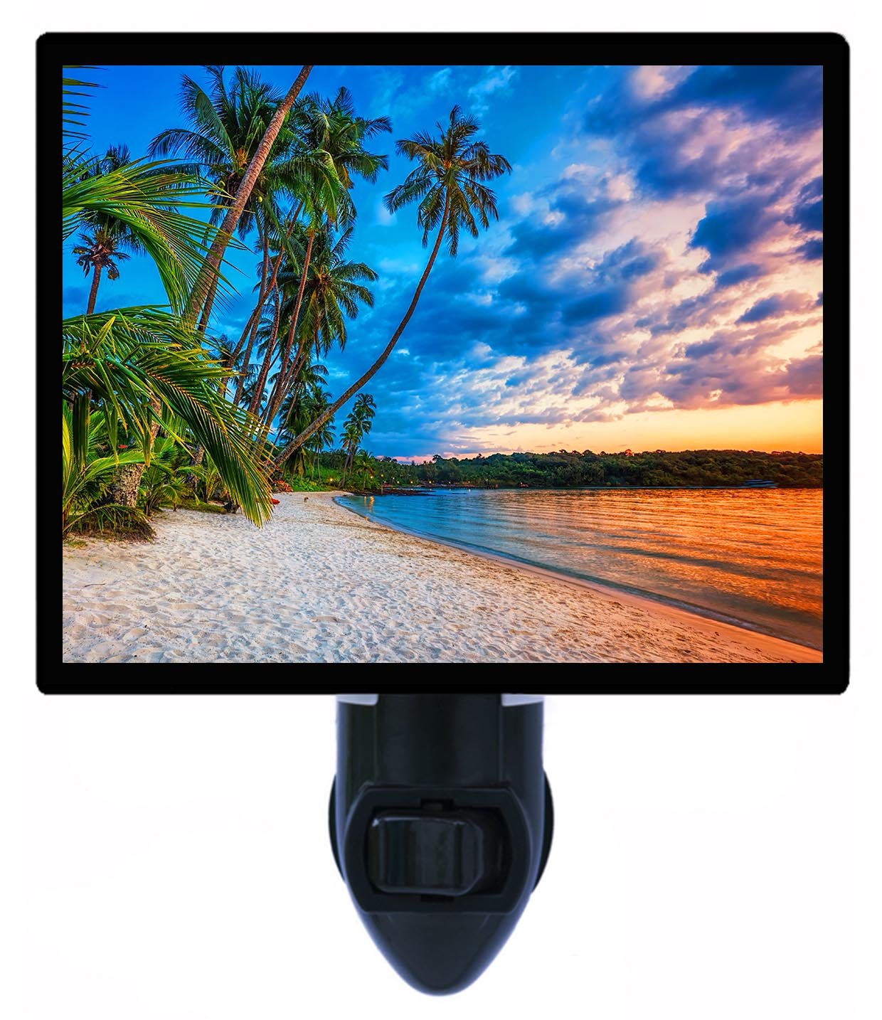 This Night Light features a fully enclosed 4-watt bulb that ensures safety and a visually appealing glow. The 3" x 3.75" tropical beach image is printed with eco-friendly inks in the USA, offering fade resistance and vibrant colors. Designed for indoor use, it plugs directly into standard sockets with an adjustable plug and supports interchangeable images for versatile decor. Ideal for bedrooms, offices, or as a unique gift, it combines energy efficiency with modern aesthetics.