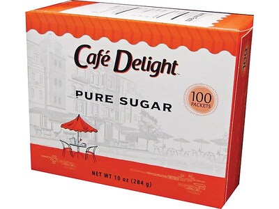 Description Add sweetener to beverages with this box of 100 Cafe Delight pure sugar packets. Measure sugar into coffee or tea easily with these pre-portioned sugar packets. These packets include pure, granulated cane sugar, which dissolves quickly in hot drinks. Each box contains 100 Cafe Delight packets, so there is plenty for staff and visitors in the office. Natural sweeteners 10 oz. sugar packets Ingredients: pure sugar Product is kosher Contains 100 sugar packets per box Stock your coffee station with Dixie Crystals sugar packets to let employees, customers, or office visitors sweeten their coffee beverages to taste. The natural sugar in these packets is made from sugar cane, not sugar beets or artificial sweeteners. Granulated SugarThe sugar is granulated for easy measurement and cleanup. Spills can be swept up or wiped off the counter without smearing.Multiple PacketsEach box contains 100 individual packets, so there's enough for everyone in the office. Convenient Individual PacksConvenient individual packs let each person use as much sugar as he or she wants without having to measure it out of a shared sugar jar. Packets are also great for when you're on the go or if you want to add sugar to a hot beverage at your desk instead of in the break room. Specifications Brand : Dixie Crystals Quick Ship : Yes Customizable : No Weight : 0.81 lbs. per Box