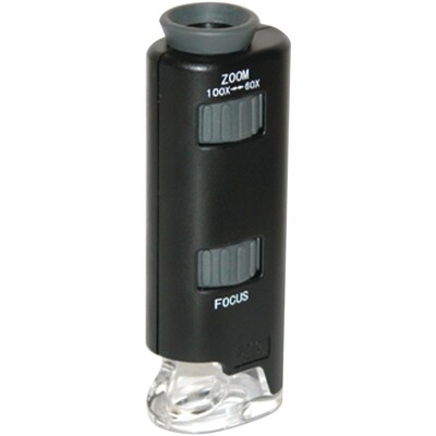 Description Black micromax LED 60x–100x pocket microscope with power and zoom controls. Black Built-in LED light provides a bright, clear image Size: 3 1/4" x 1 1/4" x 3/4" Battery: 3 SG3 button cell batteries Magnification: 60-100x Eye piece Rubber The MM-200 MicroMax Plus™ from carson optical is a powerful 60-100x power magnification pocket microscope with an extremely lightweight and portable design This pocket microscope features a built-in LED light that provides a bright, clear image and a rubberized eyepiece for comfortable viewing The MicroMax LED™ fits easily in your Pocket so you can bring it with you anywhere Specifications Brand : Carson Optical Customizable : No Weight : 0.10 lbs. per Each