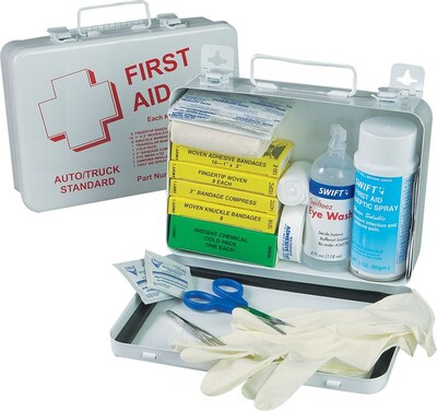 Description Medium-aerosol spray truck first aid kit has 6 5/16"(L) x 9 1/16"(W) x 2 3/8"(H) case size and comes in quantity of 12 per case. North Truck Medium-aerosol spray truck first aid kit measuring 6 5/16" x 9 1/16" x 2 3/8" is ideal for tucks and automotive. Kit includes 2 ammonia inhalants, first aid spray, a 1/2" x 5 yds adhesive tape, a 2" gauze bandage, 6 aspirins and more. Case size: 6 5/16"(L) x 9 1/16"(W) x 2 3/8"(H) Includes (8) fingertip woven bandages, (16) 1 x 3" Woven strips, (8) knuckle woven bandages, (1) triangular bandage, (1) cold pack, (2) bandages compress 3"., (1) eye wash 4 oz. Includes (2) ammonia inhalants, (1) first aid spray, (1) adhesive tape 1/2" x 5 yd, (1) gauze bandage 2", (6) aspirin, (4) antiseptic wipes, (10) non-adherent pads 2 x 3" Includes (1) scissors, (1) tweezers, (1) pair of gloves, (1) first aid booklet, medium weather proof box Medium-aerosol spray Keep essential supplies at your fingertips with this North truck/auto first-aid kit that comes with special first-aid spray for use in rendering treatment in the event of an emergency. This kit has bandages, tweezers, gloves, wipes, aspirin, a cold pack, and eyewash, so you can treat a vast array of injuries. Specifications Brand : North Customizable : No Weight : 1.00 lbs. per Each