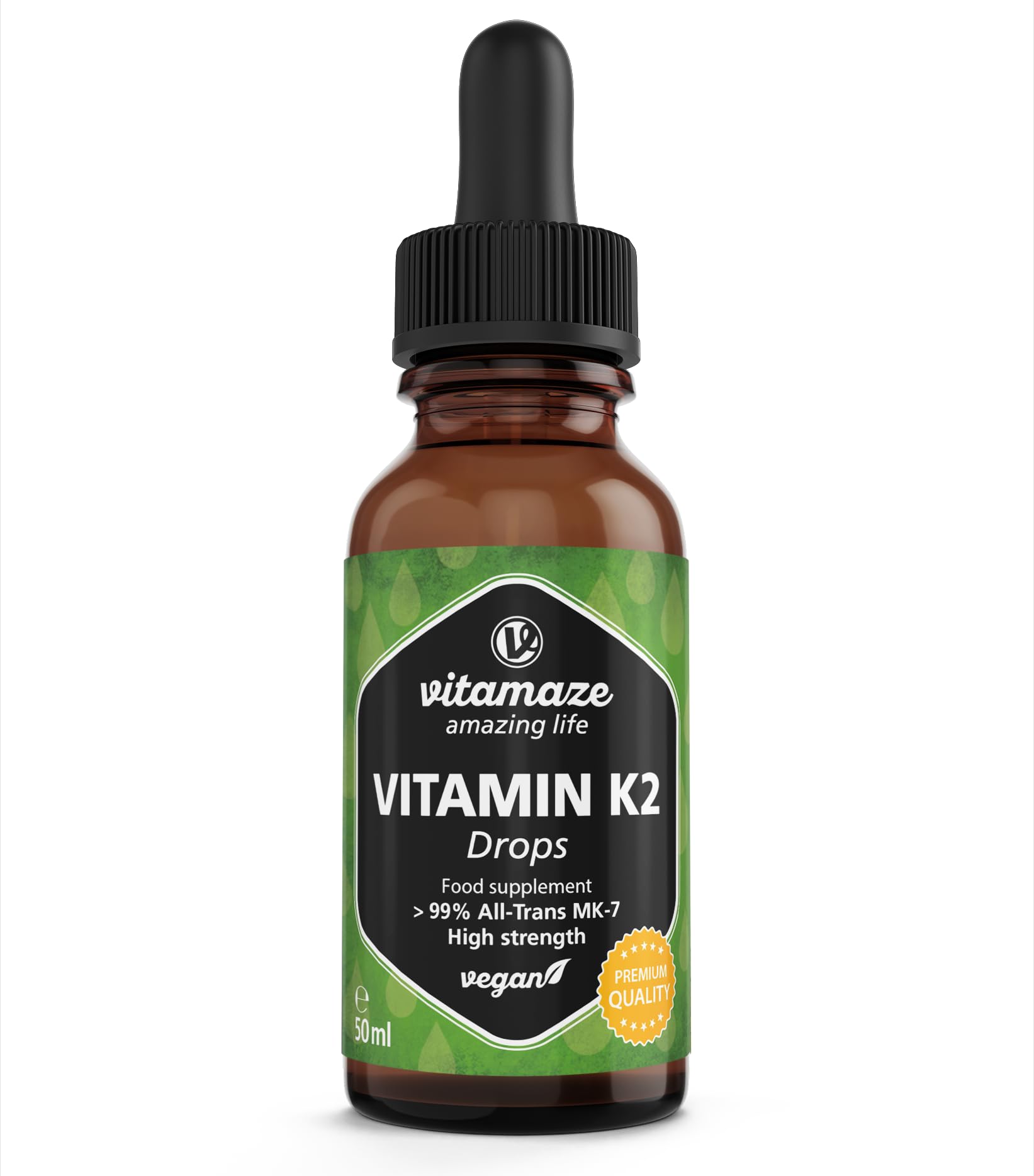 Vitamaze Vitamin K2 Drops deliver a high-strength 200 mcg dose of pure MK-7 (All-Trans form) per serving in a vegan, additive-free liquid formula. Packaged in a 50 ml light-protected glass bottle with a BPA-free pipette, this German-made supplement ensures superior bioavailability and precision dosing. Ideal for professionals seeking to support bone density and cardiovascular health, especially when supplementing with vitamin D, it offers 1700 easy-to-use drops with no unnecessary fillers or additives.