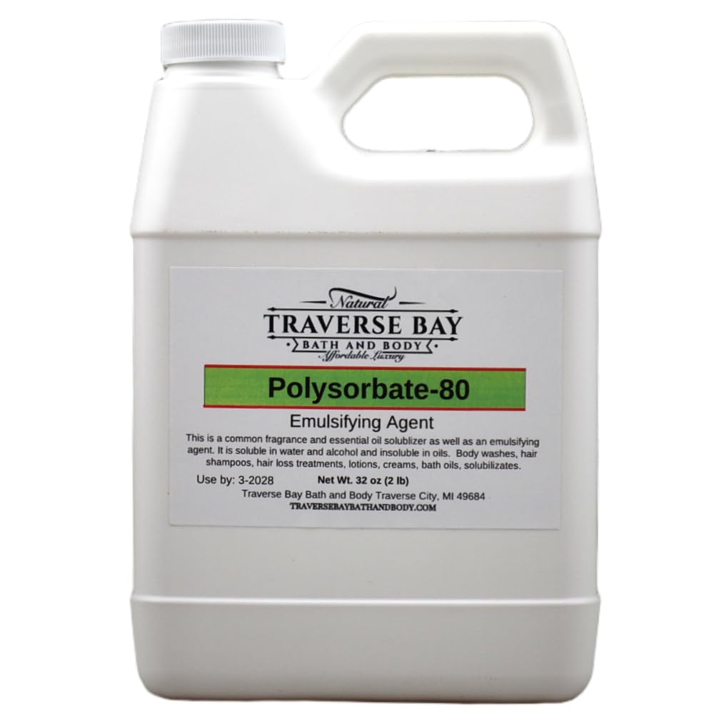 Traverse Bay Soap Company's Polysorbate 80 is a premium, 32oz safety-sealed emulsifier jug sourced from natural vegetable origins. This non-ionic surfactant expertly solubilizes essential oils and blends oil and water phases, making it indispensable for professional-grade body washes, lotions, bath bombs, and more. Ethically produced with fair-trade practices, it offers reliable, water-soluble performance in a bulk size perfect for serious skincare formulators.