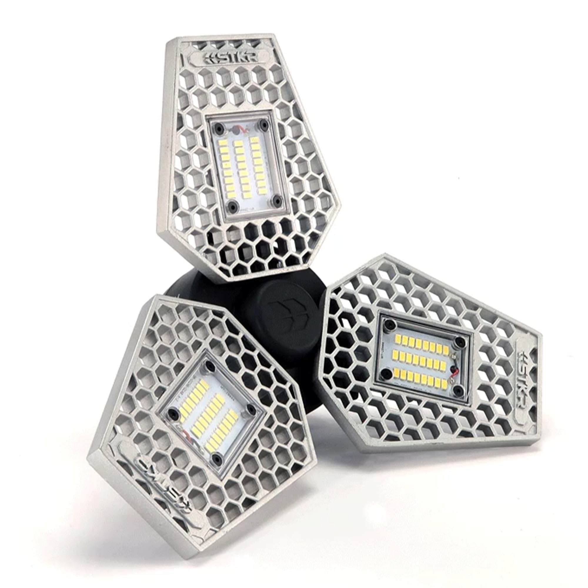 The Striker Concepts 00342 TRiLIGHT is a motion-activated ceiling light that delivers an impressive 4000 lumens of brightness. Designed for easy installation without tools, it features three adjustable light panels and is perfect for illuminating garages, basements, and more. With a sleek modern design and remote control functionality, this ceiling light combines practicality with style.