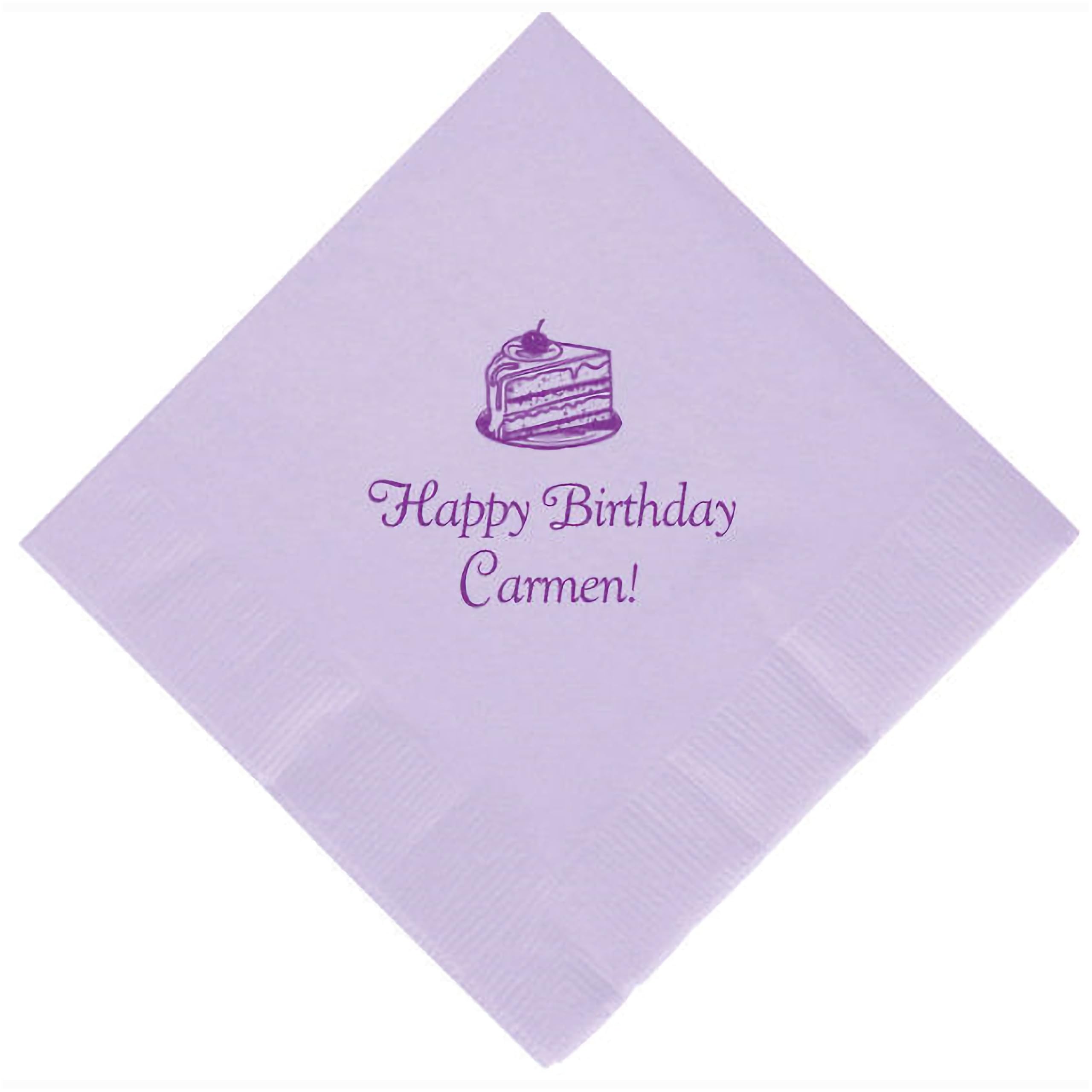 These 5x5 inch personalized cocktail, beverage, or dessert napkins from Favor Supply Store feature customizable images and two lines of text, available in multiple napkin and foil imprint colors. Lightweight and stylish, they add a sophisticated, coordinated touch to any birthday celebration.