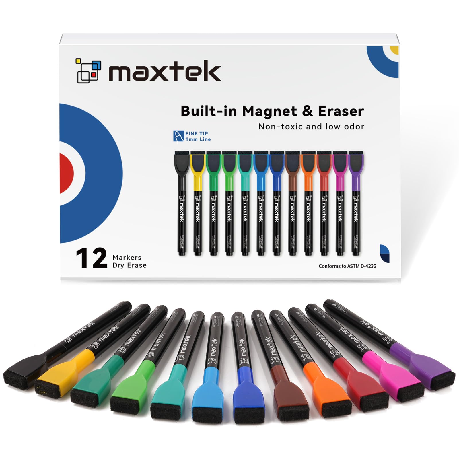 Maxtek Magnetic Whiteboard Pens offer a professional-grade, low-odor, non-toxic ink experience with 12 vibrant colors and fine 1-2mm tips. Featuring reinforced magnetic caps for secure placement on any metal surface and built-in erasers for quick corrections, these dry-erase markers combine safety, convenience, and style—perfect for dynamic office environments and creative minds alike.