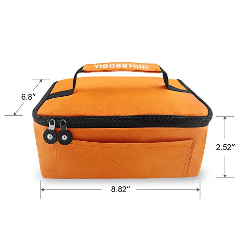 Product Name:YIBOSS MINI Personal Portable Electric OvenVoltage/Frequency:110V/60HzProduct Dimensions:8.8"W x 6.8"L x 2.5"H YIBOSS MINI Features and Benefits:You can heat your pre-cooked meals and frozen food for home、office、business or outdoor.*Very convenient-Plug and you can go what you want to do.*Healthy-Food was cooked by yourself and you will never use microwave to heat your meals everyday.*Save money-hot meals without the expense of eating out,costs less than a penny per meal.Notice:*You can use most any appropriately sized flat bottomed container (with tight cover) as the maximum heating/cooking temperature will not reach over 176 degrees. (The warming plate will cycle off and on maintain a maximum temperature of 176 degrees.) At this temperature food will be kept well above the recommended 135 to 165 degrees for food safety, but not hot enough to burn your food or container.How to use:1.Unzip the bag,open the lip.2.Place your meal on the heater tray.3.Zip the lip closed.4.Plug in the power cord to turn on your YIBOSS MINI.5.Go about your day.this Oven will take 60~90 minutes to full heat your meal(Frozen food takes longer).6.After you remove your meal,pls unplug the power cord to turn off Mini Oven.PS:The heating time should be set according to quantity and temperature of dishes.Most meals will complete in 60~90 minutes.but If you are heating up a Frozen store meal I suggest you heat it up 1 1/2 to 2 hrs to be fully heated.Pay Attention: Caution hot! ! ! The container of just heated food is very hot,do not touch it directly immediately.If you want to take it out from Mini Oven,pls use thick gloves, wet towel or extract folder.If you have any other problems with our product,pls refer to the user manual or fell free to contact us.