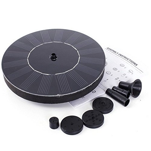 Specifications: Color: Black Solar Panel: Polycrystalline Silicon 8V/1.6W Solar Panel Brushless Pump: 7V/1.4W Max. Flow of Pump: 200L/H Max. Water Height: 35-65cm Max. Lift of Pump: 110cm / 43in Waterproof Grade: IP68 Solar Panel Dia.: 160mm / 6.3in Pump Size: 38 * 30 * 25mm / 1.5 * 1.2 * 0.98in Weight: 182g / 6.44oz Package Size: 17 * 16.5 * 4.5cm / 6.7 * 6.5 * 1.77in Package Weight: 262g / 9.27oz Solar water pump operation suggested: 1. Remove the film which covers the solar panel before using; 2. Make sure there is no leaf or anything else shade a part of solar panel; 3. Ensure the pump under the enough sunshine(suggested in the midday sunshine); 4. Pull out of the plug(the head part) firstly, and make the pump work for seconds to let the air go out of the pump; 5. Then put on the plug to see if it could work well. Notice: 1. The birdbath and stand are not included. 2. Clean the pump regularly. 3. Don't make the pump work without water for a long time, or its lifespan will be shortened. 4. The sprinkler pumps will work continuously only under strong sunshine. It will also be affected by weather, seasons, places, etc. Package Include: 1 x Pump 7 x Different size nozzles 1 x User manual