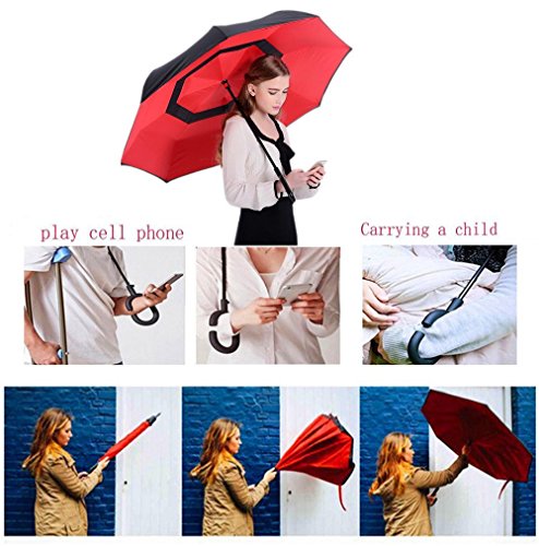 Innovative inside out design It adds a nice twist to our classic umbrella by turning inside-out when you're not using it. In this way, the dry inner side of the umbrella comes on the outside, keeping the wet side away to keep you dry when you make it in from the rain. Easy to operate and safe to use With a simple click of the embedded button, you can open and close the umbrella in confined spaces when entering or exiting a building or car and it's less awkward and more safer to open and close when in crowds, since the danger to poke in people's eyes has been removed by the design. Convenient to place and drip free It can stand up on its own, ideal for when you have nowhere to prop your umbrella up against. It will also keep the wet part of the umbrella inside once you've closed it, so things don't get dripped on when you put it away after coming indoors. Durably windproof The straight umbrella easily slices through all winds. Due to its aerodynamic design, the umbrella always finds the most comfortable position in the wind which makes it exceptionally pleasant to use, even in strong gales. If the canopy flips, it can be rectified at the push of a button. Specification: Model: New Conversion Inverted Umbrella for car Cloth Material: double layers high-density water repellent fabric Rib Material: carbon fiber high hardness skeleton Self Standing design: Can stand up on its own Umbrella Handle: Rubberized plastic matte painting handle with C shaped Be suitable for 1~2 person Weight: 560G Size: 23in * 8 panels Package Size: 39.3 * 5.9 * 6.2 inch Package Contents: 1 * Creative inverted umbrella with C-shaped Handle