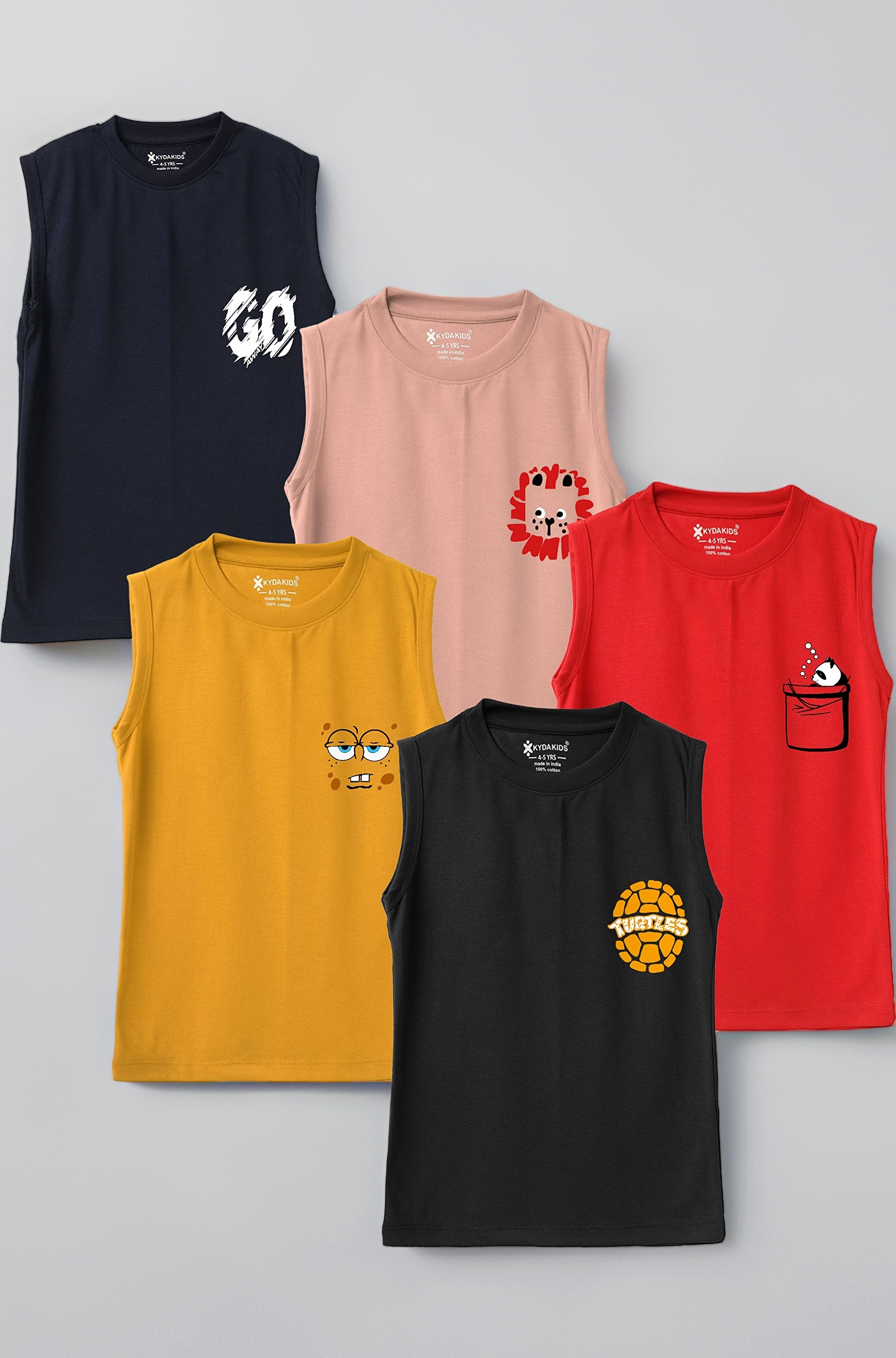 KYDA Kids Cotton Printed Regular Fit Vests are crafted from 100% premium cotton with expert tailoring to ensure a comfortable, breathable fit for boys aged 8-9 years. This 5-pack features vibrant, fade-resistant prints designed for all-season wear and easy machine wash care, making it the perfect blend of style, durability, and convenience for active kids.
