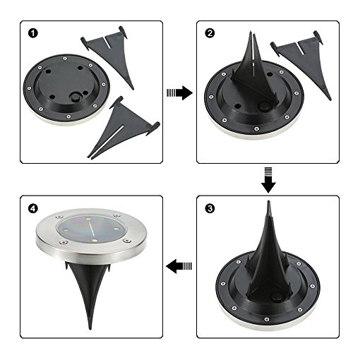 Perfect ideal sunlight on the ground ▶ Light Sensor: Built-in light sensor which automatically turns on automatically at night and turn off during the day. ▶ design of solar charge: Solar energy saving chip and 4 LEDs, illumination time 8-10 hours. ▶ High Quality Solar Panels: more effective (conversion of 18% durable, 6 to 8 hours of sunshine, 8 to 10 hours of light). ▶ For Better resistance to water: Durable waterproof IP64 waterproof rubber ring and stainless steel hardware More resistant to corrosion and sustainable use for more than 2 years of age. ▶ Longer life span: more durable LED lamps with a life of more than 100,000 hours. ▶ The beautiful solar lamp enhances your plants, passages, Landscapes, corridors, gardens, yards, lawns, swimming pools and With the addition of a higher brightness. ▶ More stable: Base is in the form of clove and can be quickly installed and push into the ground, making it ideal for lighting changes. Note: ★ PLEASE MAKE SURE THE SWITCH IS IN THE on position to charge in the sun. ★ Before Use, Make sure it is completely exposed to electricity for 8 hours on sunny days. (a cloudy day will lead to low battery and a reduced life span). ★ PLEASE DON 'T FORGET TO INCLUDE A soft ground, floor, you may damage the lamp. Product Description: LED: 4 Item Weight 520g Shade: Light White/Warm light Solar panel: 2 V 100mA Waterproof rate: IP65 Waterproof Material: Stainless Steel + ABS plastic Product size: 12 x 13 "(D * H) Package includes: Solar lamp x 4 Instruction Manual x 1