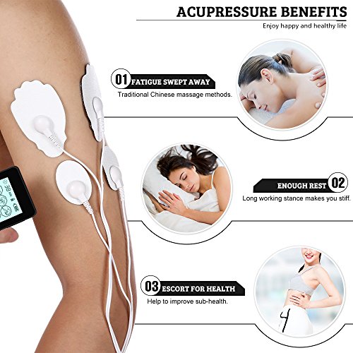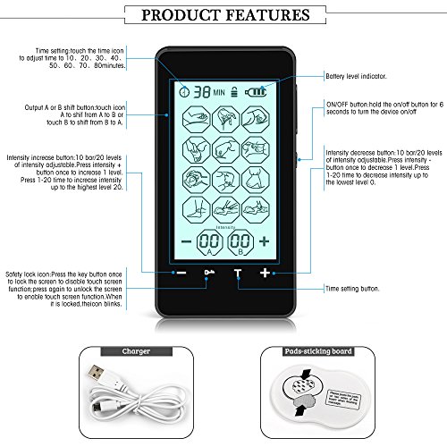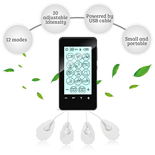 Do you suffer with pain, muscle tension, stress or poor circulation?This TTNS machine (Transcutaneous electrical nerve stimulation machine) can quickly relax muscles and relieve pain) It is a modern day home therapy device using the latest bio-electrical technology) It is designed to provide relaxing, deep soothing sensations in areas where your body and soul) Don't live with unhealthy physical and mental tension anymore.Features:1) Touch screen2) A-B dual channel for massaging multiple body parts with different strength levels simultaneously3) 12 massager modes4) 20 level of pulse intensity/strength5) Safety lock: quick press "lock" twice to avoid any setting change from accidentally touch, unlock at anytime.6) Adjustable timer setting from 10 to 60mins (the default timer is 20mins)7) 8 enhanced self-adhesive reusable electrode pads(4 big & 4 small pads)8) LED lights shut off after 5s to prolong battery life9) Auto shut down when the preset duration ends10) Portable pocket-sized design,conveniently use at anywherePackage including:1) 1 x Tens Machine 2) 4 x Large Pads 3) 4 x Small Pads4) 2 x Lead Wires5) 1 x USB Cable6) 1 x USB Adapter7) 1 x Collection Board8) 1 x Acupuncture Point Chart9) 1 x User Manual