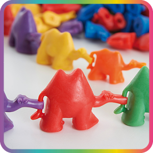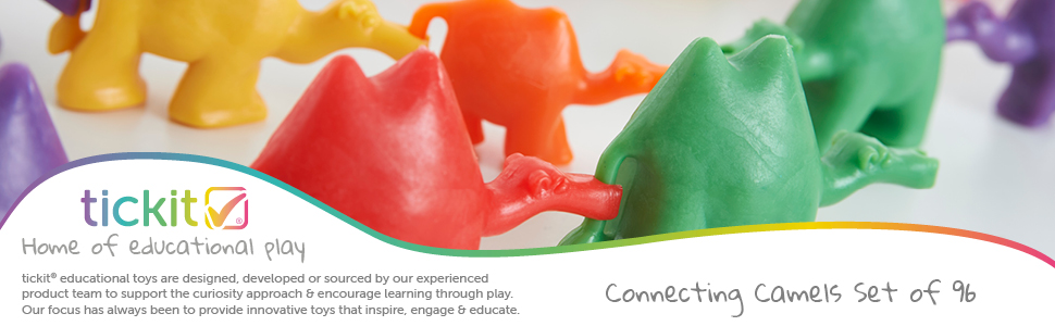 The TickiT 54300 3D Connecting Camels Pack includes 96 durable plastic camels in 6 colors and 3 sizes, designed to develop children's mathematical and fine motor skills through engaging, open-ended play. Suitable for ages 3+, this award-winning educational toy comes with a multilingual activity guide, making it a versatile tool for both home and classroom learning.