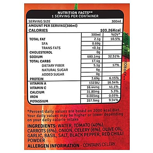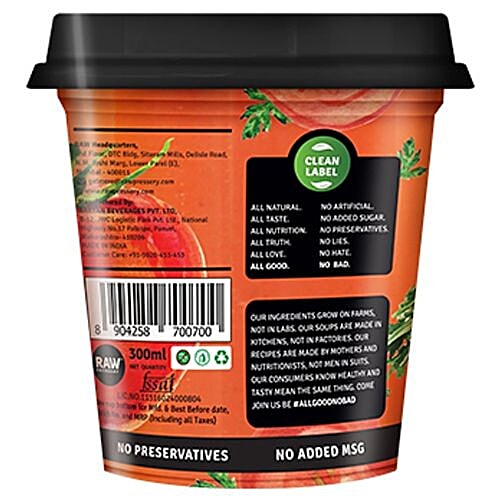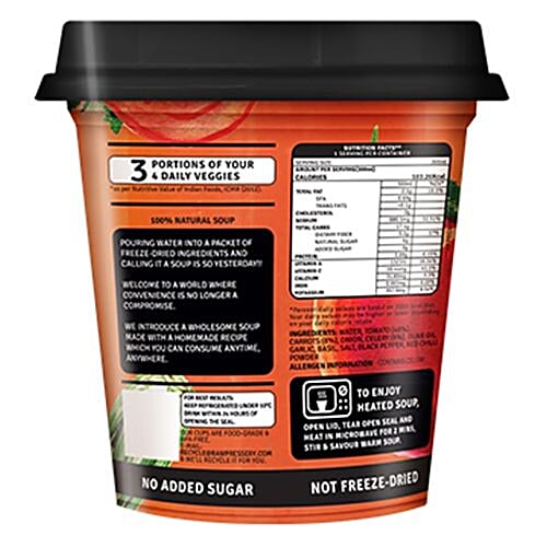 About @import url("https://www.desercart.com/static/froala_style_v2.min.css"); RAW Pressery Tomato Soup is a Ready-To-Eat soup which is delicious, wholesome and packed with the goodness of fresh vegetables. It makes the perfect appetizer and can be relished as a mid day snack or in between meals. These soups can also be carried on-the-go, as they are fit for direct consumption after heating for 45 to 60 seconds. Ingredients @import url("https://www.desercart.com/static/froala_style_v2.min.css"); Tomato, Carrot, Onion, Capsicum, Celery, Red Lentil, Salt, Pepper