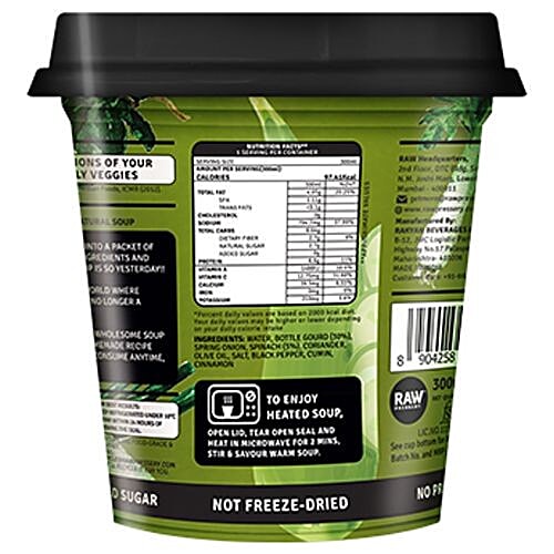About @import url("https://www.desercart.com/static/froala_style_v2.min.css"); RAW Pressery Mixed Veg Soup is a Ready-To-Eat soup which is delicious, wholesome and packed with the goodness of fresh vegetables. It makes the perfect appetizer and can be relished as a mid day snack or in between meals. These soups can also be carried on-the-go, as they are fit for direct consumption after heating for 45 to 60 seconds. Ingredients @import url("https://www.desercart.com/static/froala_style_v2.min.css"); Doodhi, Spinach, Spring Onion, Coriander, Salt, Pepper