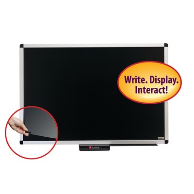 Description Post memos and share information with this Smead Justick dry erase bulletin board. Keep workers in the know with this Smead Justick dry erase bulletin board. The clear polycarbonate overlay and Electro surface technology work together to hold lists, notices and key paperwork snug against its black surface, and the versatile overlay accepts dry and wet erase markers for flexible sharing. Mount this bulletin board on your conference room wall to provide excellent visuals for meetings and presentations, and move it around as needed thanks to its lightweight design. Dimensions: 36" x 25.5" x 1" Bulletin board made from durable polypropylene with clear polycarbonate overlay for sharing memos, notices and information Features silver aluminum frame for long-term durability and easy wall mounting and black surface for high-contrast visuals Has Electro surface technology so paper sticks to its surface, as well as a clear overlay that lets you write and draw with wet and dry erase markers Includes one bulletin board and 1 AC adapter Uses 4 AA batteries (not included) as alternate power source Weight 7.9 lbs. for worry-free mounting and easy movement Accepts templates downloaded from JustickTemplates.com Flexible Power OptionsKeep this Smead Justick combo bulletin/dry erase board powered by using an AC adapter. In areas or situations where you don't have access to electricity or an outlet, it works with just four AA batteries for extra convenience.Reduces Office Supply UseSince items stick to this combo board's Electro surface, you don't need to keep thumbtacks, tape or glue handy when you want to post notices or memos. The dry/wet erase option also cuts down on paper usage, allowing you to write down information as you go during presentations or meetings so you don't have to hand out supplemental materials.Fuss-Free UseRely on this Smead Justick combo bulletin dry erase board to last through the long haul thanks to its sturdy aluminum frame and premium materials. The board itself boasts strong polypropylene construction for enduring quality, while the clear overlay features polycarbonate construction that cleans up quickly without ghosting or staining. Specifications Brand : Justick Customizable : No Weight : 1.00 lbs. per Each