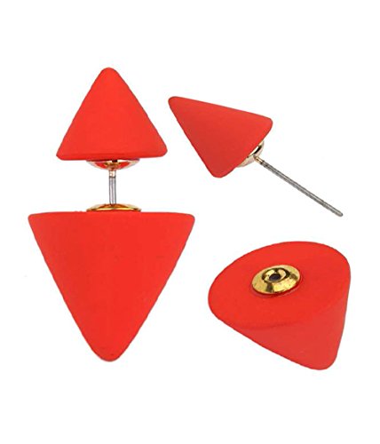 Metal based goldtone red-orange peekaboo resin stud matt finish cone earrings. Small cone earring rests on the ear while the larger cone peeks out from behind. Small earring is approximately 1/2 inch in diameter with large earring being 5/8 inches in diameter. Entire earing is approximately 1 1/2 inches tall. Comes gift ready in velvet gift bag by HW Collection. Nickel and lead compliant. Fashion/costume jewelry piece. There may be some unavoidable color difference between the real items and the pictures because of the brightness, contrast, resolution or other factors of varying monitors.