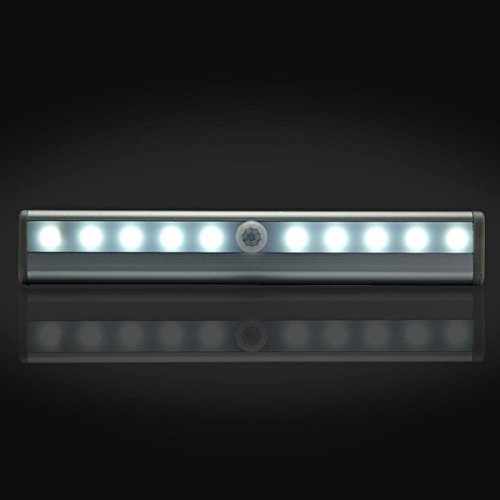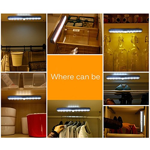Specifications: Sensitivity Distance : about 3 meter LED Qty: 10 LED Light Color: Pure White Battery: 1.5V X 4 AAA (without batteries) Light-emitting Delayed extinction time: 15 seconds Light weight: 110g / 3.9oz Suitable for place: The light with an adhesive strip can easily attached any where.And it's ideal for the bedroom, baby room, closet, cabinet, corridor, workshop, basement, garage, stairwell, oil depots, roof, door, garage entrances and other places. Notes: The LED light won't light up during day time when it is bright enough. Don't activated the LED night lights too close. The light of one night light may caused. What You Can Get: - 1 x 10 LED Sensor Night light - 30 Days Money Back Guarantee, 1 Year Replacement Warranty