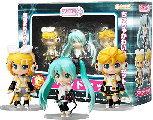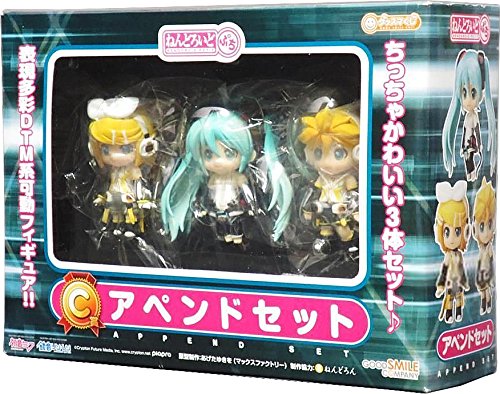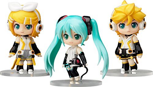 The cute Append versions of Miku, Rin and Len are joining the Nendoroid Petite series! The first ever set of lottery-based products from Good Smile Company are finally here! This mini-figure set of Hatsune Miku, Kagamine Rin, and Kagamine Len was originally available as prizes only in certain places in Japan through a lottery system. Our staffs spotted them in Japan and brought them back to the United States for fans of the Vocaloid family to enjoy. This set of Nendoroid Petite Append Set features three Vocaloid characters, all wearing the outfits based on the additional voice library packs 'Hatsune Miku Append' and ' 'Kagamine Rin/Len Append'. Enjoy the unique appearance of the three Append version Vocaloids, all in cute Nendoroid Petite size! The figures in this set are approximately 65mm (~2.5") in height (NOTE: Due to the unique design of each figure, the actual size of the figure may be slightly smaller or bigger than stated). Each figure comes with a mini display base.