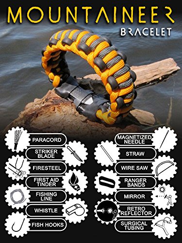 This 14 piece survival bracelet covers the widest range of tools available. It's ready for any challenge from starting fires in high elevations to catching fish along the shore, and cutting down trees to build the ultimate escape raft or shelter. If your life is on the line, what will you have on hand? Paracord Wire Saw Surgical Tubing Firesteel Striker Blade Fishing Line First Aid Tinder Packets Fish Hooks Needle Whistle Mirror Retro Reflector Ranger Bands Straw