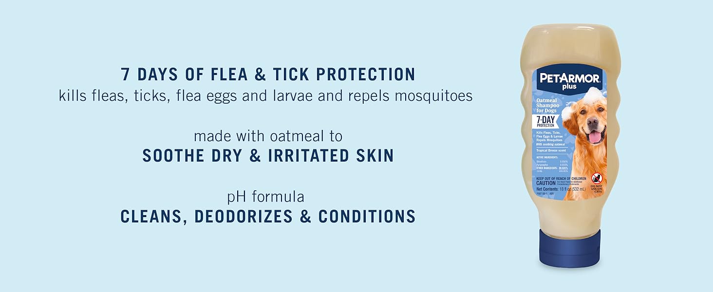 PetArmor Plus Flea and Tick Shampoo is an 18oz oatmeal-based formula designed to kill fleas and ticks for up to seven days while soothing sensitive skin. Featuring a tropical Hawaiian ginger scent, it cleans, deodorizes, and conditions your dog's coat, suitable for dogs and puppies over 12 weeks old, providing an effective, vet-alternative pest control solution.