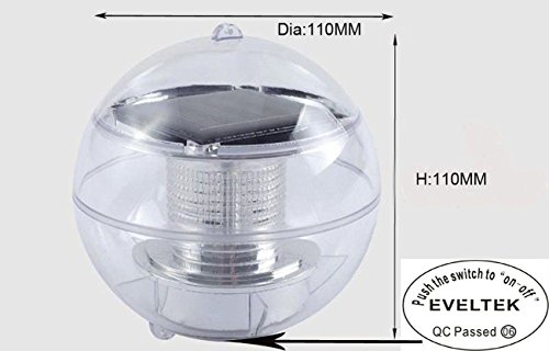 Note: Please do not recommended for use in chlorinated water. Suggest to buy more than 5 In order to better show the effect of SOLAR floating pool light Package Content: 1x Solar floating pool light The solar floating light is ideal for night the time lighting of the garden,lawn,patio walks or wherever needed.You can also charge the light outdoors the use as indoor illumination. Built-in solar panel absorbs sunlight to power led lights; Provides up to 6 hrs of nighttime illumination; Floats on the surface of pool, lake or pond. Each Gently luminous light kit is made of durable anti-heat plastic for years of use. It is of our latest improved solar panel providing better performance and prolonged usage time. The solar panel converts sunlight during the day time and recharge the battery. At night the light turn on automatically. The independently operating lights have an average run time of 6 to 10 hours (No power cord needed). Basic Info: Light Source:LED Lamp Lamp Body Material: PC Plastic,Corrosion protection Light Type:Solar Power:0.1W Illumination Time:12h Cell Type:Ni-MH Battery Charging Time (H):12 Usage:Garden, Street Voltage:1.2V Battery:Ni-MH 600mA Solar Panel:2V 40mAh LED:1 Bright LED Working Life:150000 Hours Features: Enhance your garden by day and add mains-free light at night. No need to dig up your garden to lay expensive mains cable. Can be installed in seconds and moved around with ease. Can be spiked into lawns or screwed into decking. Up to 10 hours operation once fully charged. On / Off switch to override automatic function. Works in winter and waterproof design. Sensor: Automatic sensor activates at dusk
