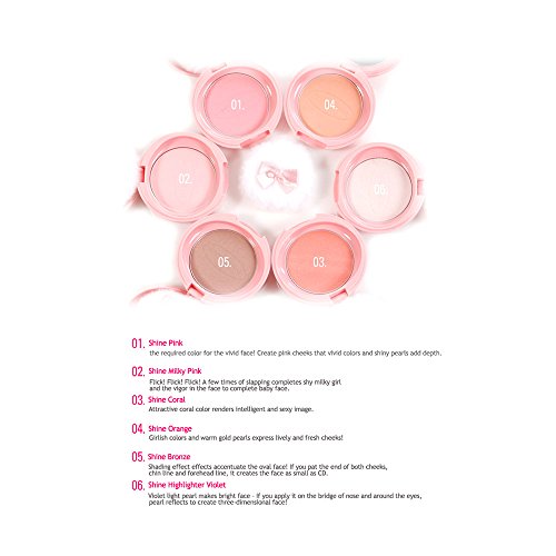 Harmony of vivid colors and shiny pearl! Create cute and vital cheek! Long lasting powder makes smooth without being cracked or adhered - long time duration! It contains eight kinds of herbal extracts to protect the skin from the skin irritation and stress, and relax the skin. Complete with shiny and clear skin! Color No 1. Shine Pink the required color for the vivid face! Create pink cheeks that vivid colors and shiny pearls add depth. Color No 2. Shine Milky Pink Flick! Flick! Flick! A few times of slapping completes shy milky girl and the vigor in the face to complete baby face. Color No 3. Shine Coral Attractive coral color renders intelligent and sexy image. Color No 4. Shine Orange Girlish colors and warm gold pearls express lively and fresh cheeks! Color No 5. Chine Bronze Shading effect effects accentuate the oval face! If you pat the end of the both cheeks, chin line and forehead line, it creates the face as small as CD. Color No 6. Shine Highlighter Violet Violet light pearl makes bright face - If you apply it one the bridge of nose and around the eyes, pearl reflects to create three-dimensional face!