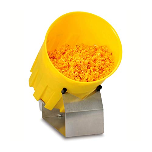 It's perfect for bars, restaurants, and patio hot spots, holding 2.5 gallons of popcorn with the lid off, and 4.5 gallons of savory products with the lid on (to allow tumbling action). It gently tumbles the flavors on the corn, which can then be stored right in the stay-fresh container. Additional tubs are available for storage of multiple flavors. The Mini Tumbler pairs well with the new 15-lb. Cheddar Classic pails (#2403), contact us today for availability. To make cheese corn, simply heat the cheese per the instructions, then pour on the popped corn. Review: I may turn orange from eating too much cheese popcorn! - Because of one review I was a little apprehensive about this item being too small. I shouldn't have worried. This thing is huge. I have a Presto Orville Redenbacher fountain air popper. This tumbler dwarfs one batch of popcorn from my popper. I thought I would have a problem with the rubber bumpers holding up the drum not being rollers but the drum slides over them easily. It is not pretty but it is sturdy and well made. It should last a long time. I only have two problems and they are personal preferences. 1. I have to turn the coconut oil spray upside down to use it. 2. The rocker on/off switch is in the back and is not convenient. I will eventually solve this problem by moving it to the front but for now I have to reach behind and feel for the switch - a little unnerving while the drum is turning. Other than those two problems I love it. --Update-- I found that seasonings will not stick to popcorn unless they have been popped in some type of oil. I tried using coconut oil spray and it did the trick but was a little awkward. The Redenbacher fountain popper turned out to be less than ideal so when it broke down I replaced it with a theater popper from Great northern. Now I am happy as a pig and probably eat way too much cheese popcorn. Still love this tumbler. Review: Impractical - Do you notice the space or (lack thereof) that's left to add cheese/seasonings in the rotating tub. You can,t get your hand and a sprinkler in there. Furthermore, when I was able to get a small thimble inside with a little popcorn I could not see the popcorn turning colors letting me know the seasoning evenly disbursed, The tub is yellow. And forget about that long lost caramel popcorn recipe you always wanted to try. Unless plastic resin is a key ingredient I wouldnt pour anything warmer than slightly melted butter in this tub. Try explaining to your guest why your caramel corn smells and taste like microwaved styrofoam. The motor unit is solidly made as far as motors go. But...what did I really expect for $175 bucks ?