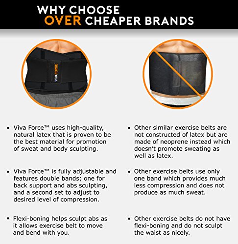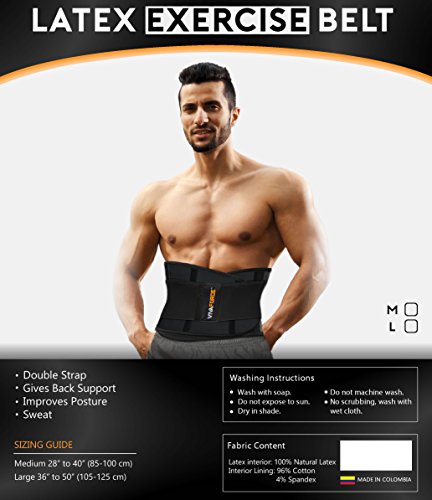 Double strap boosts workout by providing lumbar support and correcting posture for optimum exercise results. Top-notch design band with thorough testing's and materials research to stimulate fat loss through compression and perspiration. No-slip inner cotton-lined latex strap with steel flexi boning at front and back for extra firm support. Comfortable and soft inner cotton lining, latex does not touch skin. Latex has proven to be the best material for body sculpting, providing the best temperature rise and compression effects. Adjustable outer elastic band with Velcro closure for easy and fast wear secures desired fit. Adjust to high, medium or low compression as you prefer by wrapping elastic band to a tighter or looser fit. Made in Colombia. Inner strap: 100% natural latex, interior lining 96% cotton/4% spandex. Outer strap: elastic and Velcro.