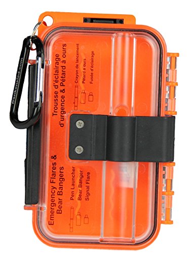 Our signal kit includes everything you need for the back country. The red 15,000 candle power distress flares fly in excess of 150 feet high, and has a sparkling tail. This tail is ideal for checking wind direction and helps make the flare more visible. At 150 feet, you will be able to get above most trees and canopies, to signal for help should you need. Our kit also includes our waterproof case which contains all the contents, and can be carried by the supplied belt clip or carabineer. For those walks in bear country, a banger can be fastened onto the launcher, then safely mounted on the outside of the case. The readied launcher can not be fired when locked into the outside of the case, and can be removed quickly and easily for use. Our instructional sticker on the back can also be used as a signaling device.