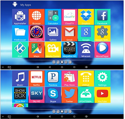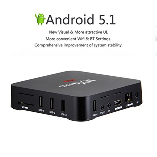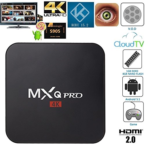 Lastest Fully Loaded Kodi preinstalled. Free to see thousands of sports, movies, cartoons, and tv channels.Hardware Specifications : Chipset :Amlogic S905 Quad-Core [email protected] GPU: Penta-Core Mali-450@600MHz+ FLASH: 8GBNAND FLASH SDRAM: 1GBDDR3 Power Supply Specifications Power Supply:DC 5V/2A Power Indicator (LED) Power ON :blue; Standby :Red Main Features OS:Android 5.1 3D:Hardward 3D graphics acceleration Support Decoder format:HD MPEG1/2/4,H.265,4K-HD, HD AVC/VC-1,RM/RMVB,Xvid/DivX3/4/5/6 ,RealVideo8/9/10 Support Media format:Avi/Rm/Rmvb/Ts/Vob/Mkv/Mov/ISO/wmv/asf/flv/dat/mpg/mpeg Support Music format:MP3/WMA/AAC/WAV/OGG/AC3/DDP/TrueHD/DTS/DTS/HD/FLAC/APE Support Photo format:HD JPEG/BMP/GIF/PNG/TIFF USB host:4 High speed USB 2.0,support U DISK and USB HDD Card reader:SD/SDHC/MMC cards HDD file system:FAT16/FAT32/NTFS Support Subtitle:SRT/SMI/SUB/SSA/IDX+USB High Definition video output:SD/HD max.1920x1080 pixel OSD type of languages:English/French/German/Spanish/Italian/ etc multilateral languages LAN Ethernet:10/100M, standard RJ-45 Wireless:Built in WiFi Mouse/ Keyboard :Support mouse and keyboard via USB;Support 2.4GHz wireless mouse and keyboard via 2.4GHz USB dongle HDMI:HDMI 1.4b with CEC AV:Support 3G:Support SPDIF/IEC958:Coaxial Network Function:Skype chatting,Picasa,Youtube,Flicker,Facebook,Online movies,etc Package Includes: 1 x MXQ Pro TV box 1 x Remote control 1 x HDMI cable 1 x AV Cable 1 x US Power adapter 1 x User manual