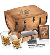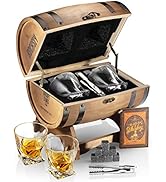 This Whiskey Stones Gift Set features 8 natural granite stones that chill your drink without dilution, paired with 2 stylish 10oz twisted whiskey glasses with weighted bottoms for stability. Packaged in a rustic wooden half-barrel box, the set includes stainless steel tongs, a velvet carrying bag, and cocktail recipe cards—making it the perfect premium gift for whiskey lovers seeking a refined sipping experience.