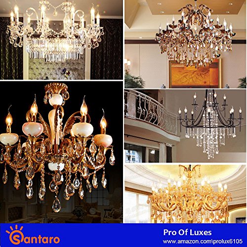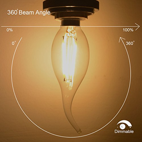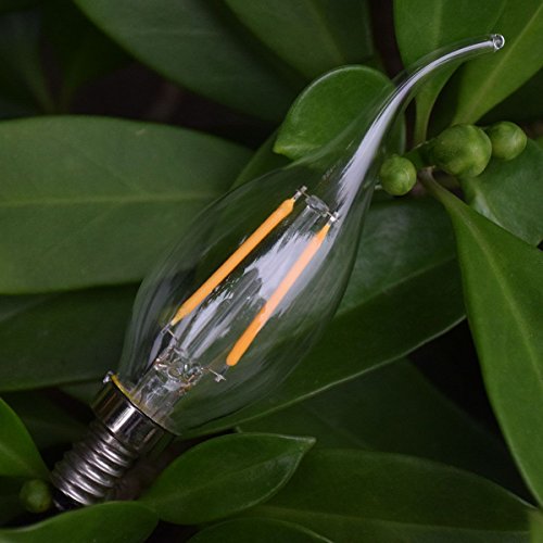 Santaro C35 LED filament candle bulb Santaro LED filament candle bulb provides a great nostalgic light,more energy saving for electric bills. Gives a full 360 degree omnidirectional light glow, fit for E12 Candelabra, can be used in restaurant, dining hall, hotel, bar living room, bedroom, dinning room, sconce, pendent, ceiling fan and desk lamp etc. Advantages: 1. Energy saving LED light to replace the conventional Incandescent Light bulbs 2. Light is soft and uniform, eyes care 3. No UV or IR in the beam 4. Instant on 5. Easy to install and operate, suitable for all E12 socket fixtures 6. Green and eco-friendly without mercury 7. 2700k Warm white light, looks comfortable and sweet 8. Over 80% energy saving compared with conventional incandescent bulb Warm Reminders 1.Our bulb is made of glass. So when you get our product, please check visually whether it is intact or not, and please be careful of your fingers. If there is any problem, please contact us. 2.Welcome to consult the latest news of our bulbs. Please Note: 1.If you want to dimming these bulbs, please upgrade your switches/lamps to support dimmable LED bulbs 2.Most traditional incandescent or CFL bulbs dimmer can not be used for LED bulbs dimming, and some poor quality dimmer may cause flicker 3.Not compatible with smart dimmer [Specification]: Base Type: E12 Wattage: 2W/4W Type of Bulb: LED Material: Glass Voltage: 110 Volts Color Rendering Index (CRI): ≥90 Bulb Features: Dimmable Color Temperature: 2700 Kelvin Beam Angle: 360 Degrees