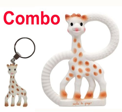 Sophie the giraffe So' Pure teething ring An all-natural rubber teether that is ideal for soothing painful gums! This teething ring made of 100% natural rubber from the hevea trees, helps to ease the pain of teething for your baby, a safe & natural teether with plenty of chewable parts (ears, horns, legs, & rings) that baby will love to chomp on, providing comfort & relief during teething. the two rings have different textured surfaces for baby to chosse from according to his age needs, to give even faster relief for aching gums. With a ridged surface for erupting teeth & a raised bump surface for soothing sore gums. Lightweight two-ring design, easy for small hands to hold & play with. You might wonder why your baby needs a key chain. Babies like to model after parents and your baby sees you hold and use your key ring each day. Yet your baby doesn't need any keys. The key to this is that it's made of various soft textures that permit baby to touch and bite on. It's an instrumental key to promote healthy teething. This is not a Toy! Warning: Choking Hazard Smal Parts, Not intended for children umder 3yrs.