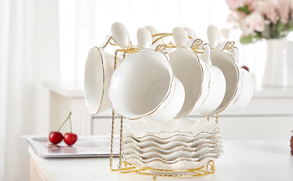 The DUJUST Tea Cups and Saucers Set features six 200ml British white porcelain cups with petal-shaped design and German Heraeus gold trim. Each cup rests on a non-slip frosted base and comes with matching saucers, spoons, and a golden metal stand for elegant storage. Crafted from food-safe, lead-free porcelain, this set blends luxury aesthetics with practical durability, making it ideal for upscale tea parties or gifting, backed by a 90-day return policy and 2-year warranty.