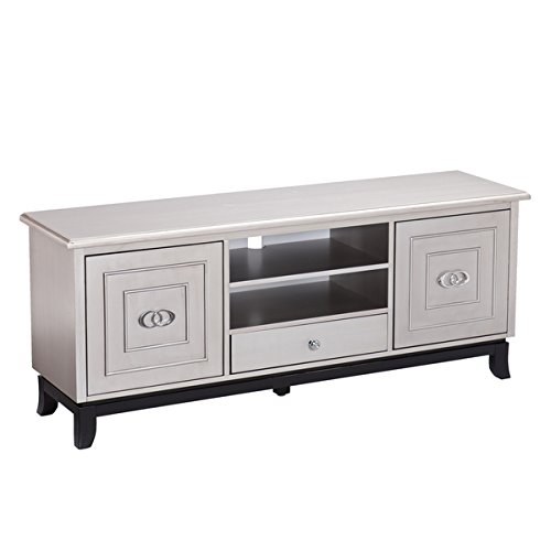 - Accommodates a flat panel TV up to 58 inches wide overall | Features two (2) cabinets, two (2) adjustable shelves, two (2) media shelves, and one (1) drawer | Offers one (1) cord management opening with access from either shelf
