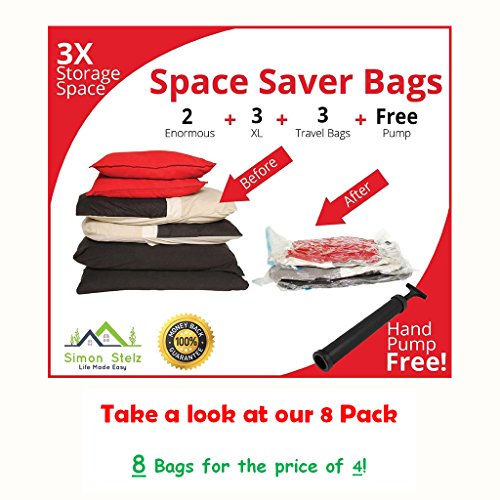 The ENORMOUS Simon Stelz Storage bags are big enough for a queen comforter & a pillow or two large pillows & two small pillows. These space saver bags are great for MOVES, TRAVEL, BEDDING and PILLOW STORAGE and putting away PATIO CUSHIONS. 8 X SPACE SAVER BAGS - 2 Enormous (51"x 40"), 3 Jumbo (40"x 28"), 3 Suitcase Travel Roll Up Bags (24" x 16") + FREE HAND PUMP. These space bags also protect your clothing from mildew, water, dirt, bugs and insects. The bags can be used multiple times for a variety of purposes like Out of Season Clothing, Extra Bedroom Linen like Blankets, Comforters & Pillows, Clothes that babies have outgrown and Patio Cushions. These space bags can also store clothing and bedding in your car for those unexpected Emergencies.