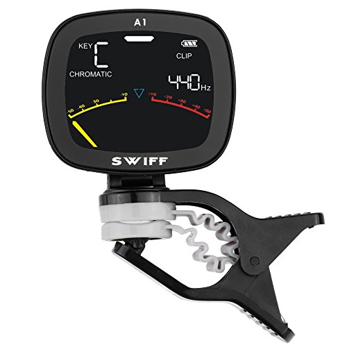 Specifications: Color: Black Tuning Scale: Chromatic, Guitar, Bass, Violin, Ukulele Tuning Mode: Vibration / MIC Tuning Range: A0 (27.50Hz) ~ C8 (4186Hz) A4 Range: 410Hz~490Hz Key: C, F, B♭, E♭(Chromatic) Flat: ♭-♭♭(Guitar, Bass) Precision: ±1 cent Response Time: <20ms Powered By: 3V CR2032 Lithium battery(not included) Item Size(with clip): 8.6 * 7.1 * 2.8cm / 3.4 * 2.8 * 1.1in Item Weight: 31g / 1.1oz Package Size: 13.3 * 10.5 * 2.7cm / 5.2 * 4.1 * 1.1in Package Weight: 54g / 1.9ozPackage List: 1 * A1 Clip-On Color Display Tuner 1 * User Manual(English)Note: Battery is not included.