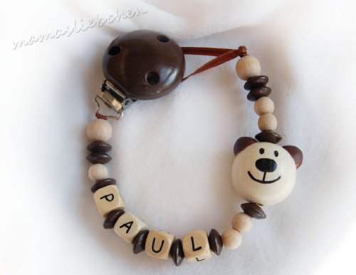 Here is your chance to acquire a fantastic pacifier chain especially for you with lots of tender loving care. Crocheted, sown and threaded by hand - every pacifier clip is unique. This pacifier clip / chain is customized and made-to-order. When you place your order, please provide the Baby´s name by sending us a message through amazon. The child friendly chain is made of wood clips with ventilation holes, wooden beads, beads of various styles and depending on the model has a hand-crocheted cover (cotton wool) a hand-sewn mini cushion (material of cotton wool and cotton padding) with a rattle; a bell or other amusing extra (see photo). Naturally the name of the child also appears on the pacifier clip. I use here top quality wooden letters of German manufacturer or white plastic letters depending on the embossed image. These chains do not only fulfil a purpose, the interwoven extras and the attention to detail encourages the little characters to play, watch and feel.It is a practical helper in the daily routine and a lovely reminder in later years! Most pacifier clips are suitable for names of up to 7 letters but of course I also try to show off longer names to best effect. In order to conform to the DIN Norm length of 22 cm (excluding clip) prescribed in Germany I use flat lentil beads or smaller bead sizes or if there is no other choice a design must be omitted. All materials used are saliva-proof, nickel-free and completely safe for children. It is possible that under certain circumstances a lot of moisture (saliva or cleaning with water) could cause the varnish to dissolve. This would only lead to an unsightly effect but does not pose any risk to health. There are many other variations of pacifier clips in my shop - it is worth taking a closer look! Excellent workmanship and the pacifier clips safety are absolute top priorities. You should however never leave your child unsupervised with the article. Safety instructions are delivered with every pacifier clip!