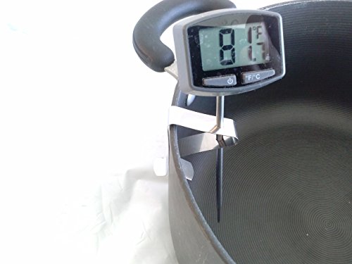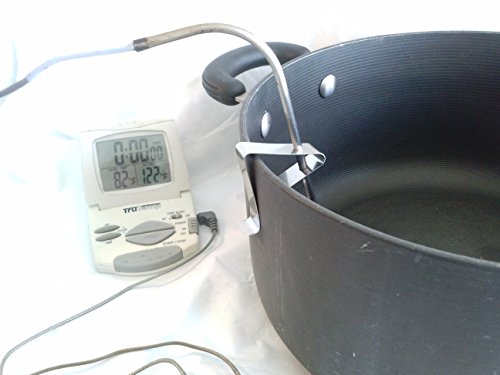 Stainless steel universal thermometer clip may be used as a replacement holder for existing cooking thermometer, or can be used to turn any probe thermometer into a fry, brewing, soup or candy thermometer.