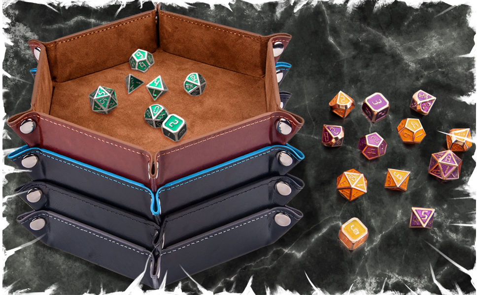The SIQUK 4 Pieces Dice Tray Set features four foldable hexagon trays in trendy colors, crafted from stitched PU leather and velvet for a premium feel. Metal snap closures enable quick assembly and compact storage, protecting your dice and surfaces while doubling as a chic organizer for everyday essentials.