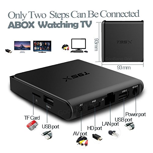 2017 Newest Model GooBang T95X: Basic features: OS: Android 6.0 Marshmallow CPU: 64 Bits Amlogic S905X Quad-Core [email protected] GPU: Penta-Core Mali-450 with HDMI 2.0 output Card reader: TF cards (Micro SD card) USB host: 2 High speed USB, Support USB DISK and USB HDD HDMI: HDMI 2.0 Power Supply: DC 5V/2A LAN Ethernet: Up to 100M SDRAM: Original 1GB DDR Flash: Original 8GB EMMC More supports: Support WiFi 2.4Ghz & Airplay/Miracast/DLNA & H.265 Support Decoder format: HD MPEG1/2/4,H.265,4K-HD,HD AVC/VC-1,RM/RMVB,Xvid/DivX3/4/5/6,RealVideo8/9/10 Support Media format: Avi/Rm/Rmvb/Ts/Vob/Mkv/Mov/ISO/wmv/asf/flv/dat/mpg/mpeg Support Music format: MP3/WMA/AAC/WAV/OGG/AC3/DDP/TrueHD/HD/FLAC/APE Support Photo format: HD JPEG/BMP/GIF/PNG/TIFF Support Subtitle: SRT/SMI/SUB/SSA/IDX+USB Support language: Chinese, English, Germany, Japanese, Korea etc. multilateral languages High qualified accessories: Brand new HDMI 17+1: support true 4K playing(60hz) GooBang Doo Safe adapter with power magnet: It can help suppress rush current efficiently, so that static electricity is released slowly. Package lists: 1 x GooBang T95X Android TV Box 1 x UK Power Adapter 1 x HDMI Cable 1 x Remote Controller 1 x User Manual