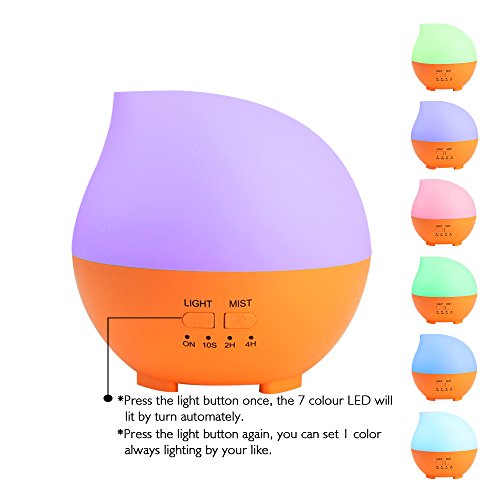 Our YCTA aroma diffuser uses the ultrasonic principe evaporation of water and oil and releases off the fragrance air.This cool mist humidifier comes with a high quality stone filter that will keep the humidifier clean and give you a soft and healthy mist. Features: 1. Modes: 10S/2H/4H/Continuous Patterns, Lights Only, Mist Only; 2. Lighting Modes: Cycle through or set it to one fixed color (You willhave 7 colors to choose from) 3. Runs about 8 hours ( Continuous spray status) with one filling of water 4. Idea for small rooms, like home, professional office settings, Yoga or massage therapy studio, and everywhere you want a heady aroma. LIGHT MODES & MIST TIME "LIGHT":Press the"light"button to turn on the LED lamp or adjust the LED night light color "MIST":Press the "Mist"button. 1st pressing:it starts to continuous spray,"ON" indicator; 2nd pressing:to be the mode of spray in 10 seconds and stop in 10 seconds."10S" indicator; 3rd pressing:to be 2-hour time working mode,"2H" indicator; 4th pressing:to be 4-hour time working mode,"4H" indicator; 5th pressing:stop working. Specification: Water Tank: 300ml Rated Voltage: DC 24V Power Output: 12W Working Time: about 6-8 hours Timer: 10S/2hrs/4hrs/ON Ultrasonic Frequency: 2.4MHZ Dimensions: ?142X135mm Package Included: 1x YCTA Ultrasonic Cool Mist Humidifier 1x Adapter 1x User Manual NOTE: 1. Do not add water over MAX line and do not shake the humidifier 2. Please add water-soluble essential oil into it for more fragrance and long lifespan 3. This is an essential oil diffuser, but you also can use it as a humidifier if you like