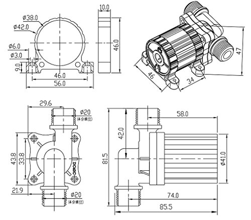 Traits: The axis is enclosed with static sealing which can avoid leaking problems It employs high performance and durable ceramic shaft Brushless, permanent magnetic rotor, maintenance-free, long life Submersible installation and entirely waterproof High efficiency, low consumption, low noise Parameters: Material: PA66+Glass fiber Power consumption: 13.2W Rated voltage: 12V Rated current: 1.1A Max flow rate: 14L/min (3.7G/min) Max lift height: 3m (9.7ft) Diameter of inlet: 20mm(1/2 inch thread) Diameter of outlet: 20mm(1/2 inch thread) Noise: Waterproof level: IP68 Lifespan: More than 30,000hrs Power supply: DC electric source (bare wire) Driving method: Brushless, Magnetic Fluids: water, oil, gasoline, acid and alkali solution etc Max working temperature: 60C/172F Item dimension: 85.8x82x48mm Note: 1. Working at rated voltage (DC12V/1.1A). The positive pole is red wire, the negative pole is black wire/blue wire. 2. This pump is centrifugal pump, it can't vent the air automatically, so it must be operated by submersible installation. (If outside water installation, you should make sure it is installed below the liquid surface) 3. When blocking, long-running is not allowed. 4. Preventing any hard particles entering the pumps. Package list: 1xWater pump