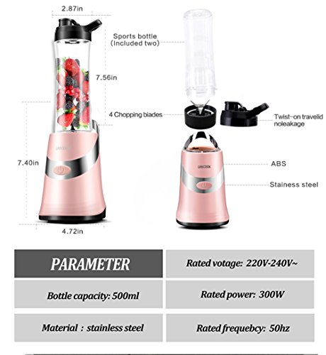 GRECOOK Mini Blender and Juicer GRECOOK Mini Blender and Juicer is different from common food processing machine, such as jug/jar counter blender and hand or immersion blender. It's lightweight, easy to carry bottles with anywhere. Multi-fuction include blending pancake batter, sauces, puddings, dressings, smoothies, frozen drinks. GRECOOK Mini Blender and Juicer Features and Functions -100% brand new -Sharper cutting stainless steel blade -Both the bottle and blade is dishwasher safe -None-button blending action with 4-angle stainless steel blades -500 ml BPA free blender bottle -Anti-Slip Mat to enhance stability and prevent the blender moving around -Easy to use, just add the liquid, followed by the other ingredients and blend -Don't lose any fibre using this blender -Bottles lock in place securely when attaching cups to blender -Base of cooling motor faster protect blender better -Designed for easy removal of blade assembly for cleaning pulse operation -Plug in outlet, just blend mixer within 1 minute -Practical and economy, fast completely do it yourselves Specifications -Product Capacity: 500ml -Rated Voltage: 220V-240V -Rated Frequency: 50Hz -Motor Speed: 22000r/min -Warranty: 24-month warranty by GRECOOK Package Include 1 X Mixing Console 1 X Blade Components 2 X Leak Proof Cover 2 X Sports Water Bottle 1 X User's Manual 1 X Filter screen